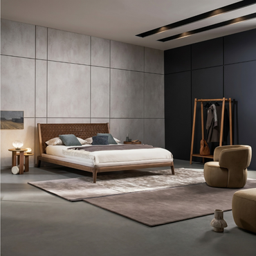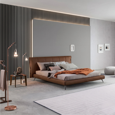 Nelson Bed 160x200 burned oak stained ashwood (frRB) frame. Headboard completely covered in 942 Fango Soft Leather. Slats included. / (Pictures attached are for illustration purposes only) Product finishing and details are as per the description stated