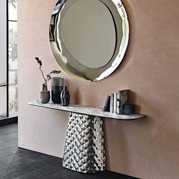 The base of the attractive and practical Atrium Keramik Console consists of two finely worked plates of couture mirrored glass. The console creates a play of soft reflections, in which the surrounding objects and light sources reverberate. The glass is shaped with an unprecedented technique that gives the surface a three-dimensional effect like quilting on fabric. This modern console is available with a top of your choice from among numerous attractive ceramic tones with a marble effect.